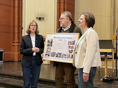 Die Ehrenvorsitzende des BGV Abt. Solingen, Dr. Beate Battenfeld, verlieh am 28. März 2026 im Rahmen einer Veranstaltung in der Lutherkirche den Denkmalschutzpreis 2025 an die Eheleute Birgit und Matthias Scheler für die Restaurierung des Fachwerkhauses Schlossbergstraße 6 in Solingen-Unterburg.